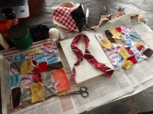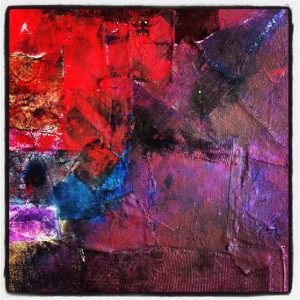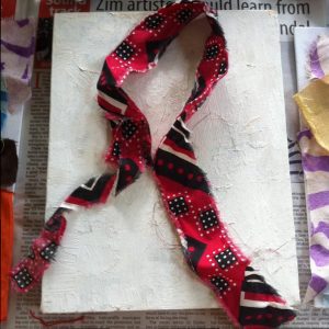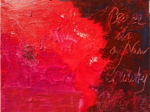 The first piece was about setting an intent. I laid a ribbon made out of Retso, the cloth evoking the spirit of the hunter. I was invoking ancestral guidance. I started to paint…red, orange, fuchsia on the left and a very dark brown on the right. ‘Peace in a new Country’. These words etched themselves on the dark side of the canvas: the ancestral blessing, I asked for.