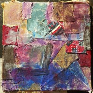 I then glued an abundance of small torn pieces of fabric on the two small square canvases (25x25cm) to create my base. Once glued I played with acrylic paintings to create a colourful layer on the background to bring harmony to the ‘mess’. I did that into two or three sittings. I had no idea whatsoever of what I would paint.