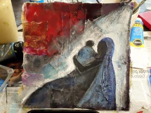 Another day, I approached the second painting with soft gazing. I saw the image of a Mother and Child peeping through, maybe a Black Madonna, I thought ‘here we are … entering the time of Christmas indeed!’ First a very bright moon light, I saw the mother out at night in the desert. In spite of being enlightened by the moon, the figure felt icy cold, I needed a warm light. A gold glow started to surround them. Warmth. Here she was in a safe space, maybe a cave, surely under a shelter; she could lovingly play with her baby now. Her inner glow is merging into the glow of Creation.